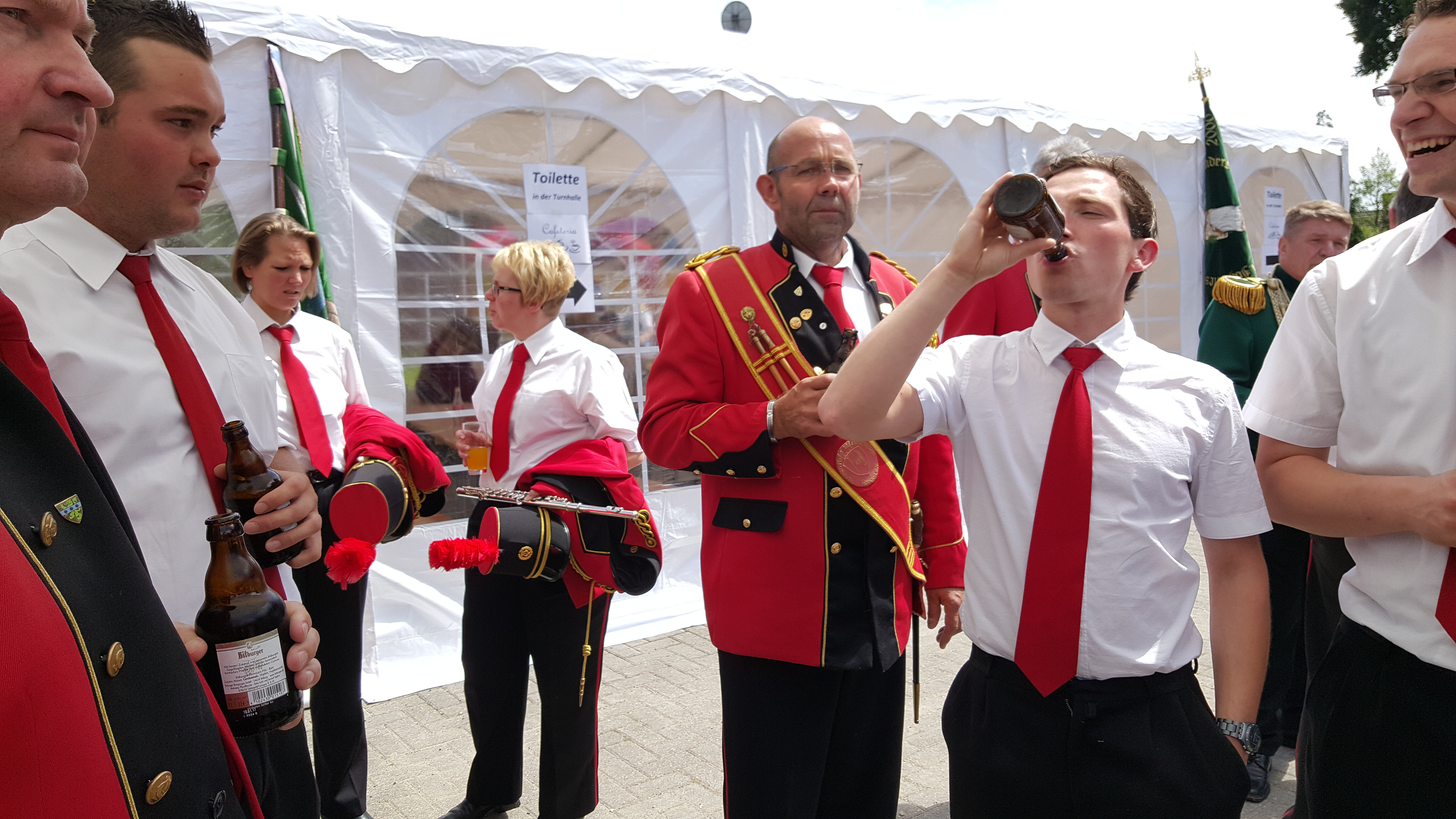 Von Meurers zogen wir Richtung Dorfplatz ein und da wir beim Umzug die Nummer 1 waren, hatten wir kurz Zeit, um uns zu erfrischen, denn es hieß reletiv zügig „Aufstellung nehmen“. Der Umzug führte uns von rechts nach links und wieder zurück. Mit einer unfreiwilligen Pause, da das Auto des Kaiserpaares plötzlich stehen blieb.