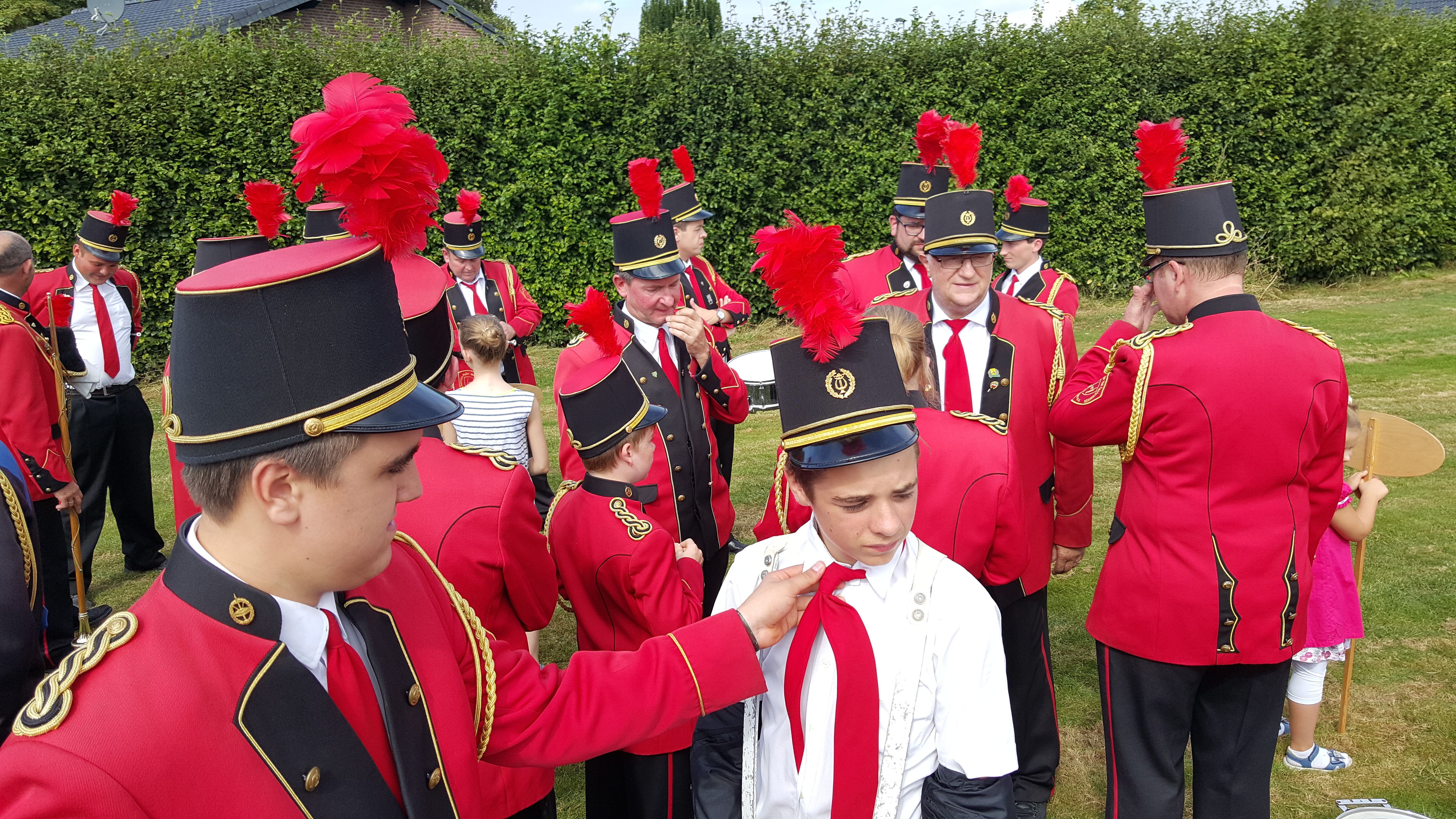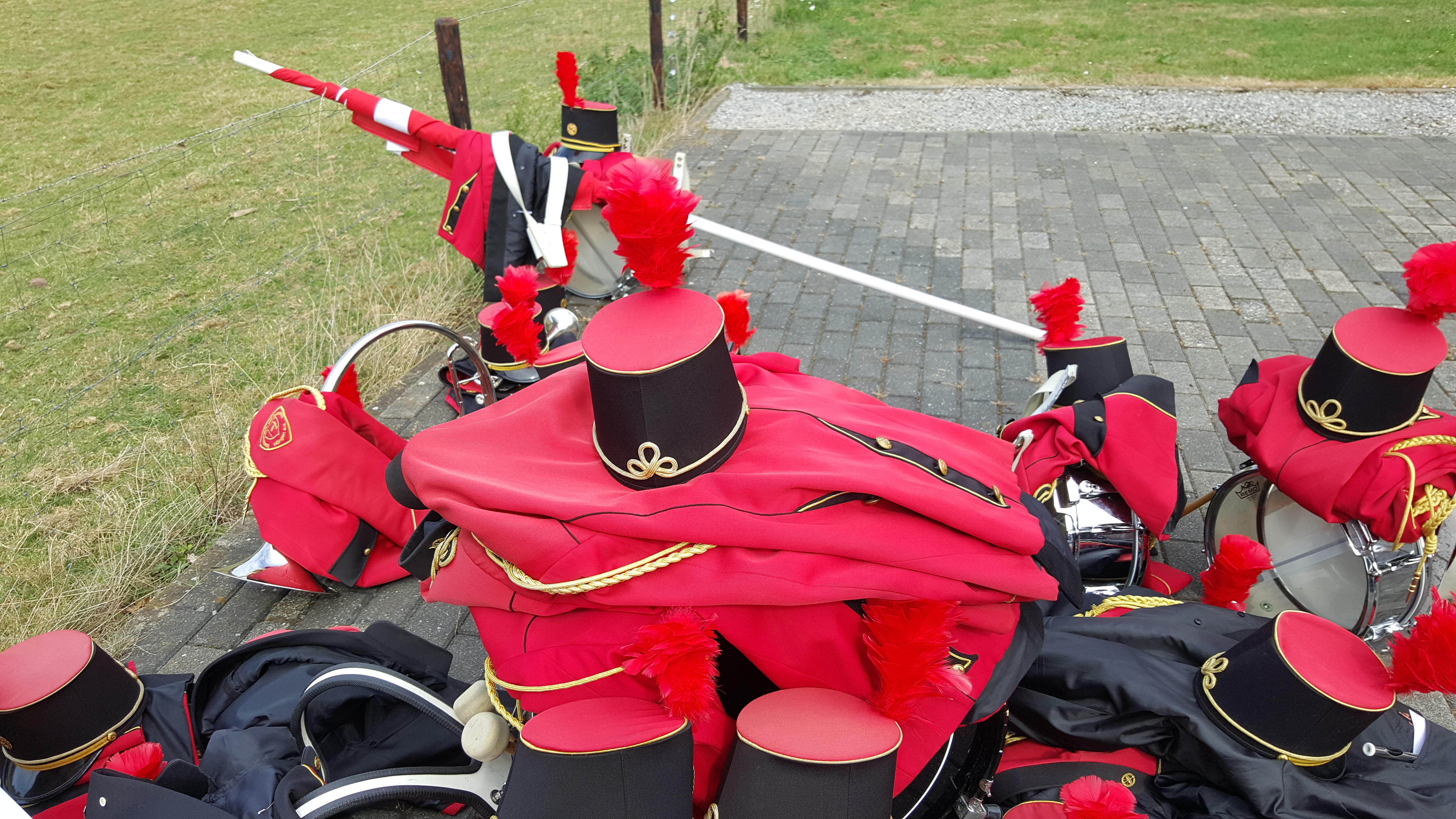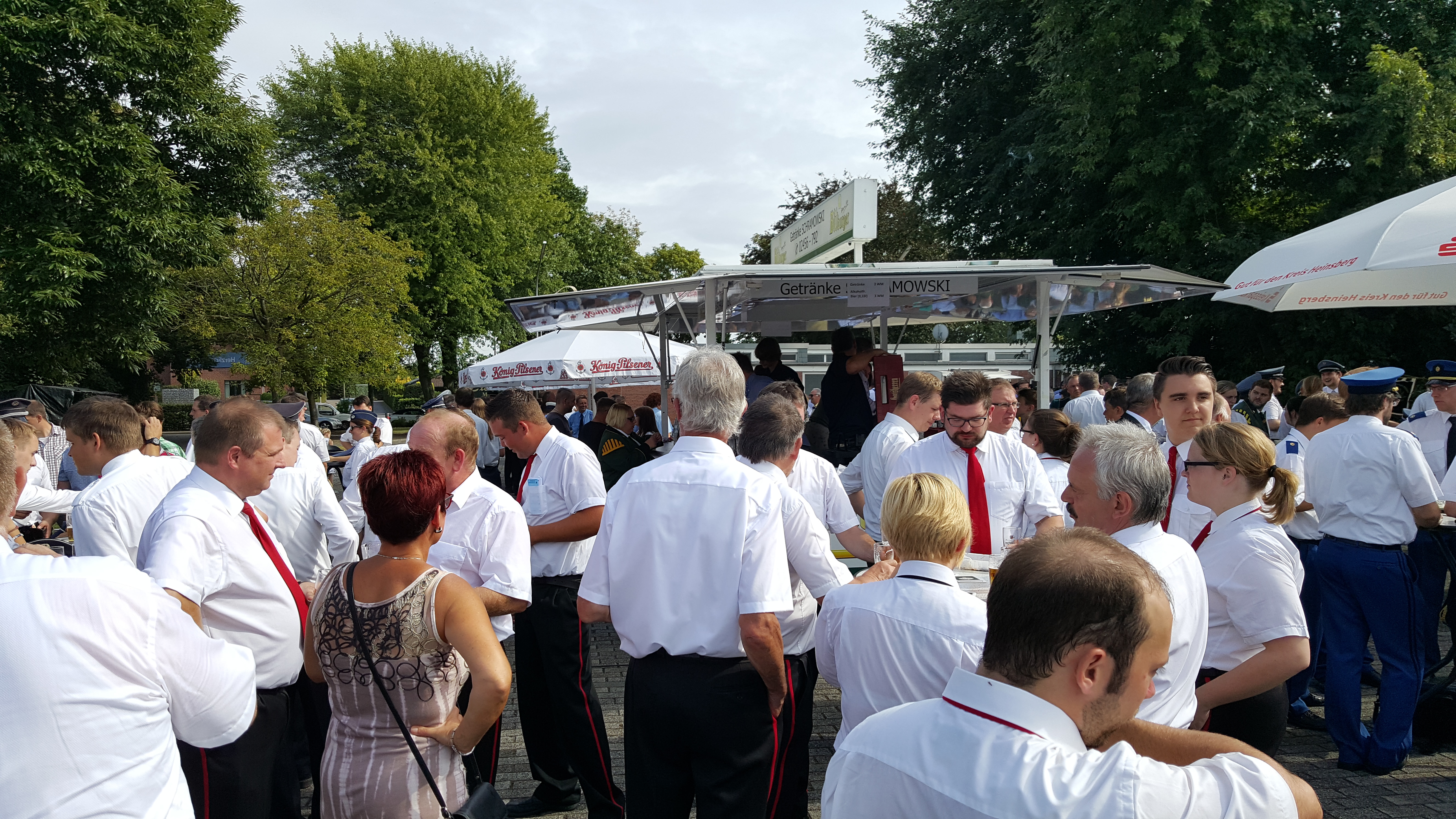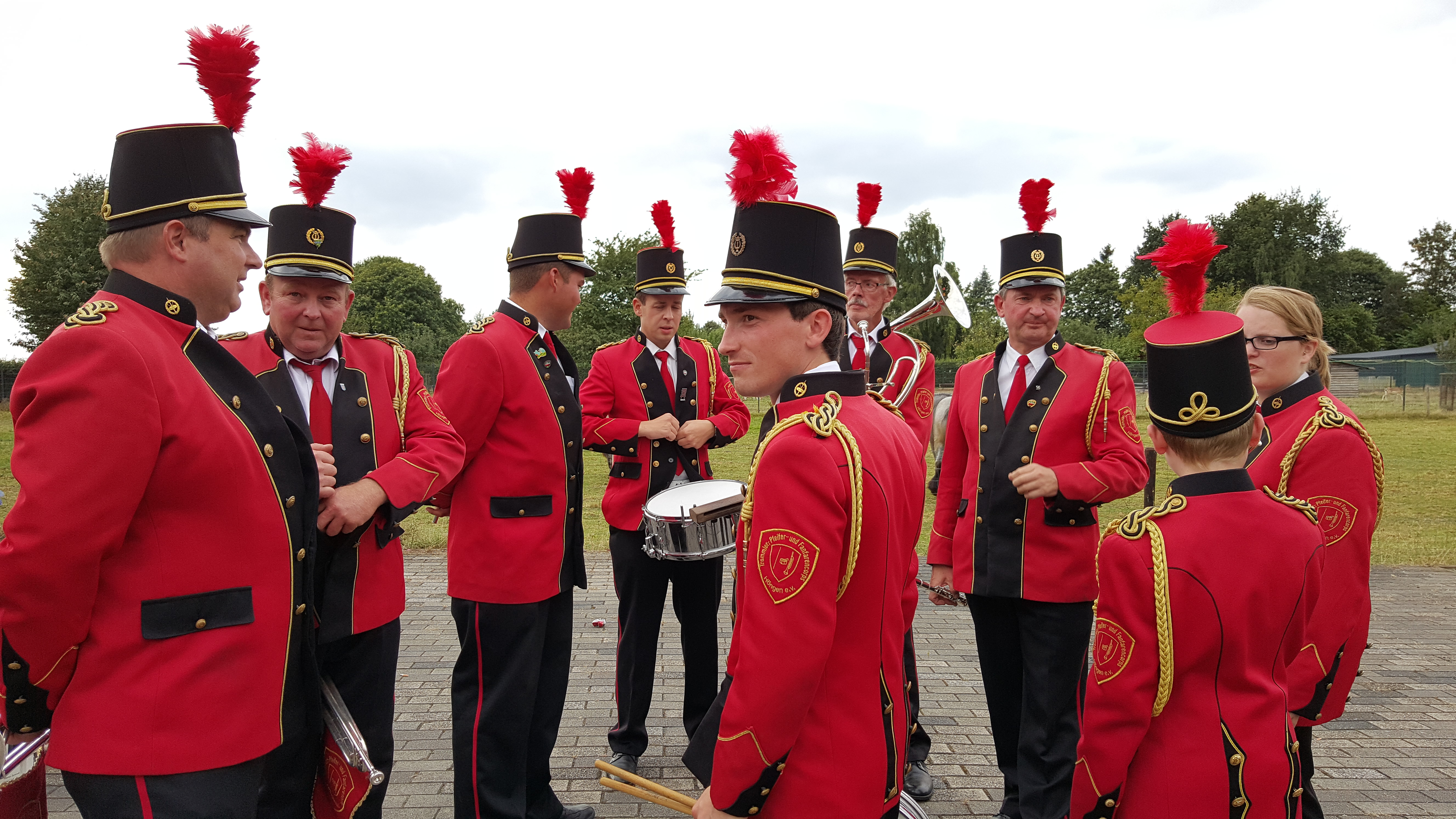 Warm war es auch diesmal, aber die Uniformen blieben nicht im Schrank. Beim Umzug wechselten wir uns mit Schalbruch ab und im anschließenden Bühnenspiel spielten wir als Nr. 13 zwei Märsche.