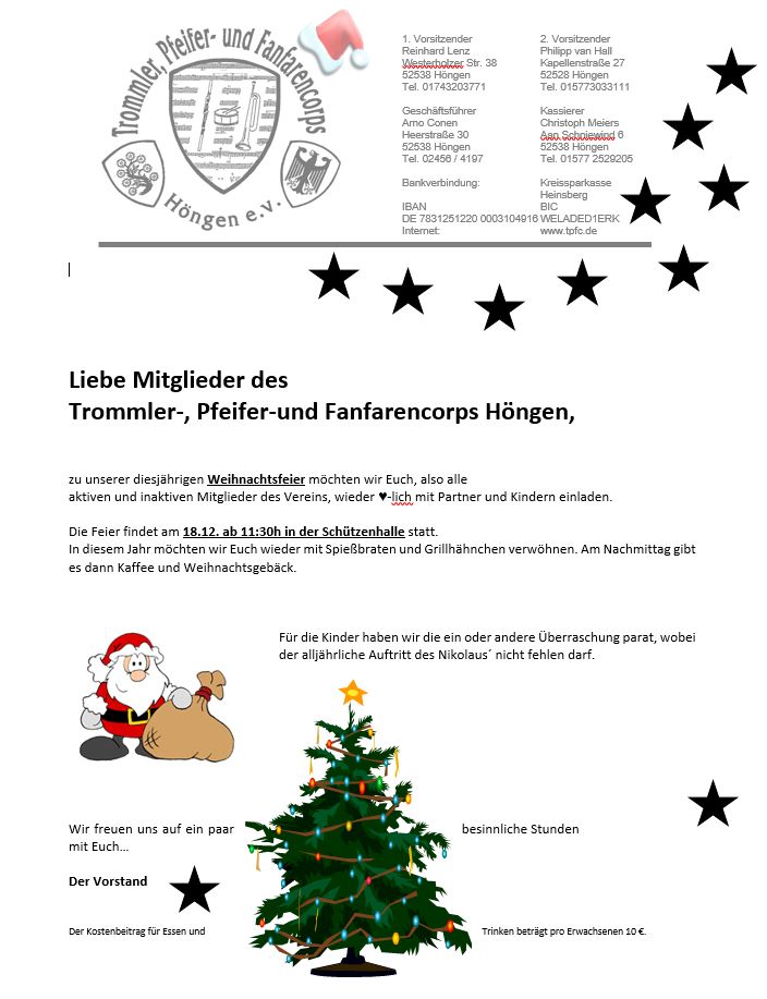 In diesem Jahr wollen wir wieder alle aktiven und inaktiven Mitglieder herzlich zur Weihnachtsfeier einladen...