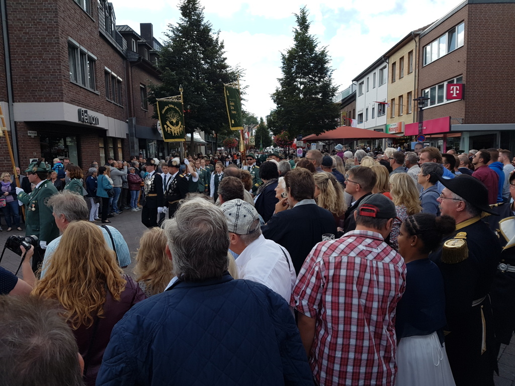 Nachdem die Nummer 76 der über 400 teilnehmenden Bruderschaften an uns vorbeigezogen war, hieß es für uns auch so langsam "aufstellen". Von der Westpromenade ging der Umzug zügig durch die Innenstadt. Die Besucher standen teilweise in 4 - 5 Reihen hintereinander.
