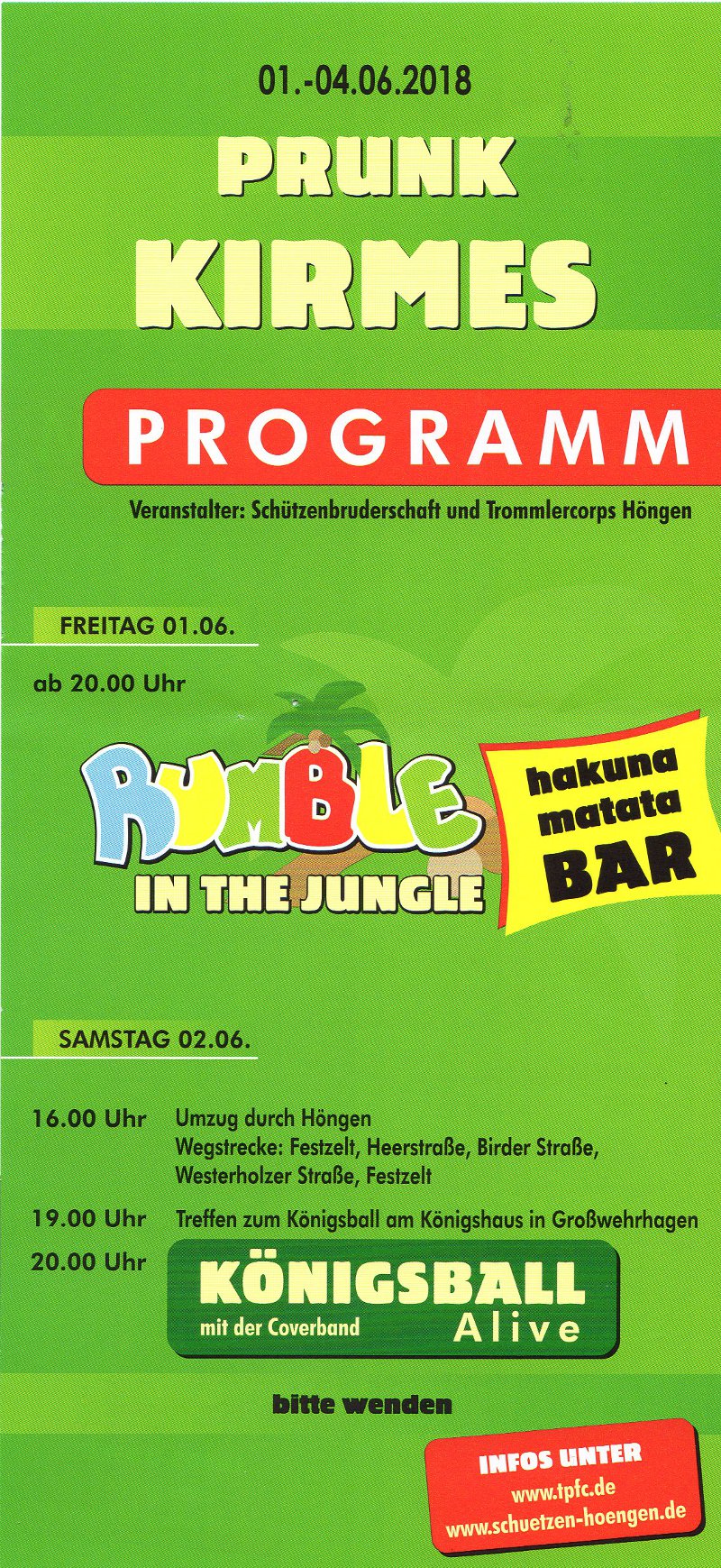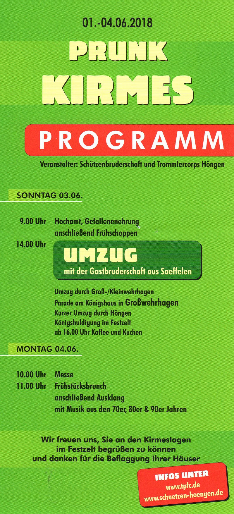 Vom 1. – 4. Juni feiert Höngen in diesem Jahr die Prunkkirmes. Veranstalter sind wiederum gemeinsam das Trommler-, Pfeifer- und Fanfarencorps und die St. Johannes Baptist Schützenbruderschaft.