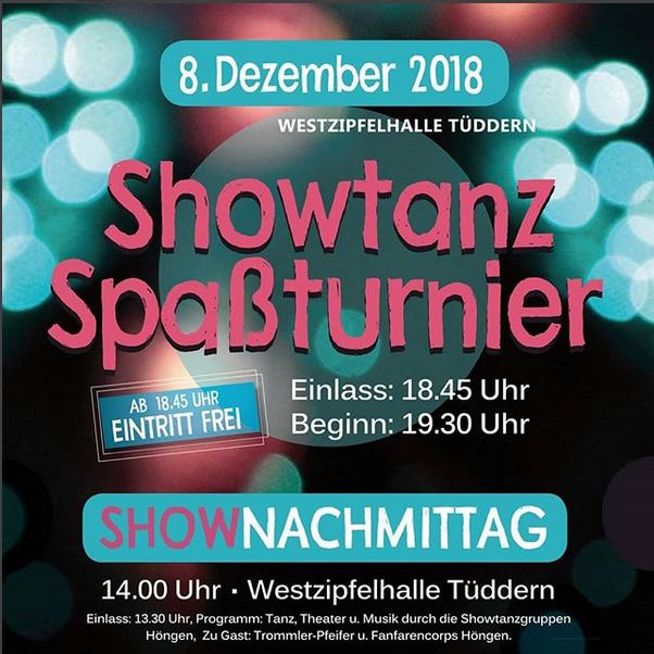Nach dem großen Erfolg im vergangenen Jahr, wollen wir auch in diesem Jahr am Samstag, den 8. Dezember 2018, in der Westzipfelhalle in Tüddern am dritten Showtanzspaßturnier der Showtanzgruppen aus Höngen teilnehmen.