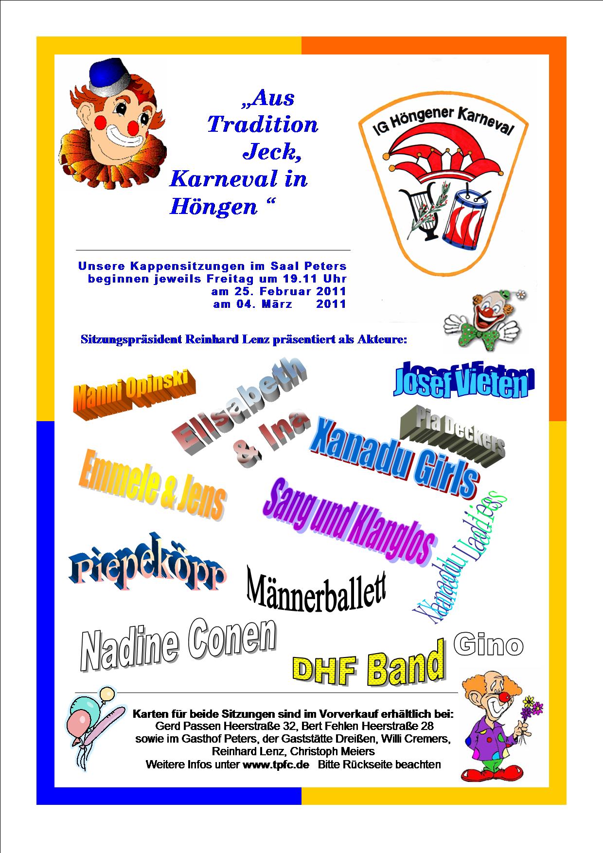 Die erste Kappensitzung findet in Höngen am Freitag, dem 25.02.2011 um 19.11 Uhr statt. Sowohl zur Ersten als auch zur Zweiten großen Kappensitzungen am Freitag, dem 04.03.2011, haben sich bekannte Größen in der Bütt des Höngener Karnevals angekündigt. Manni Opinski, Josef Vieten, Emelle und weitere Akteure sorgen für ein buntes Programm. Mit den Showtanzgruppen und Solos vom TSV „Xanadu“, sowie dem Männerballett wird fürs närrische Auge so mancher Leckerbissen geboten. Die Gesangsgruppe Piepe Köpp sowie Sang und Klanglos aus Havert garantieren für beste Stimmung. Der Sitzungspräsident Reinhard Lenz kann so wiederum aus dem Vollen schöpfen und ein abwechselungsreiches Programm mit vielen Kräften aus den eigenen Reihen präsentieren. Begleitet wird dieses Programm wie in jedem Jahr von der Sitzungskapelle der Höngener Fanfaren Band.
