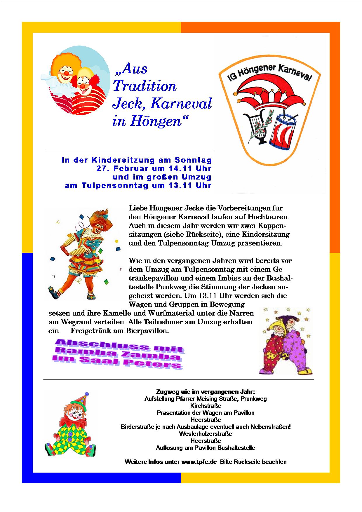 Mit diesem Motte bereitet sich Höngen auf die Tollen Tage vor. In diesem Jahr gibt es in Höngen einige Besonderheiten, der Organisationsleiter des Straßenkarneval Paul Jansen ist gemeinsam mit seiner Prinzessin Hildegard Prinzpaar der „KV Kerkever Jekke“. So werden zum Umzug als auch zu den Sitzungen Gäste aus Kirchhoven erwartet. Umgekehtt nehmen die Höngener Karnevalisten an Veranstaltungen in Kirchhoven teil, so fand bereits die diesjährige Sessionseröffnung mit mehrfacher Höngener Beteiligung statt.