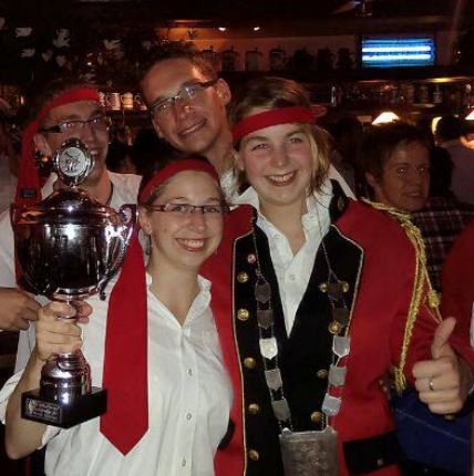 Nach dem Freudentaumel im Festzelt ging es schließlich zurück nach Höngen, wo wir nach altem Brauch gemeinsam vom Ortsschild an der Wohnstätte zur Gaststätte Dreissen zogen. Mit im Gepäck waren Ausbilder Roger, die beiden Pokale und natürlich die Plakette um Reinhards Hals. Bei Miep und Kon wurde der Sieg schließlich noch bis in die Nacht gefeiert. Wir freuen uns nun auf das Schützenfest im Nachbarort Tüddern, bei dem wir die Plakette erstmals tragen dürfen.