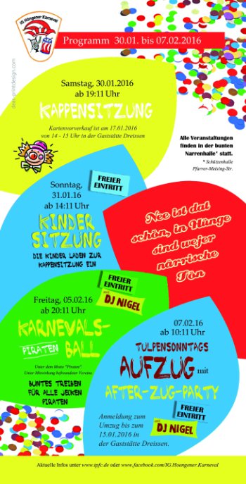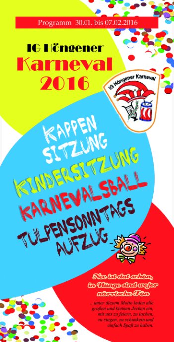 Unter dem Motto: „Nee ist dat schön, in Hünge sind wejer närische Tön“ wird auch in diesem Jahr in Höngen Karneval gefeiert. Sämtliche Veranstaltungen der Karnevalssession 2016 finden wiederum in der Schützenhalle an der Gesamtschule statt, die sich bei den vergangenen Veranstaltungen hervorragend bewährt hat.