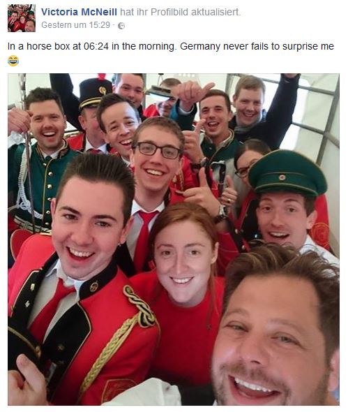 Mittlerweile hatten die Schotten über die Tage ihr besonderes Plätzchen in einem der Außenzelte gefunden, an dem man diese in Gesellschaft von vielen Höngenern jeden Abend antreffen konnte. So war es auch an diesem Sonntag und an diesem Plätzchen ging es nach Schließung des Zeltes noch bis tief in die Nacht bzw. Morgen weiter. Einige haben es sogar bis zum traditionellen Wecken um 6 Uhr geschafft. Zu Fuß nach Wehrhagen zum König und nach Harald und dann mit dem Pferdeanhänger zurück nach Höngen. Dies veranlasste Victoria Mc Neill nebenstehenden Facebook Post zu machen.