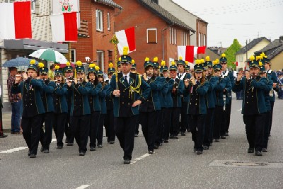 28 bunt uniformierte Vereine absolvierten einen kurzen und gut besuchten Umzug durch das festlich geschmückte Höngen. Den krönenden Abschluss des Umzuges bildete der Vorbeimarsch hinter dem Gasthof Peters, der lediglich durch zeitweiligen Regen ein wenig beeinträchtigt wurde. Umso erfreulicher war es, dass sich so wenige Musikfreunde vom Regen abschrecken ließen und nach dem Umzug den Weg auf unser Festgelände neben der Tennisanlage fanden.